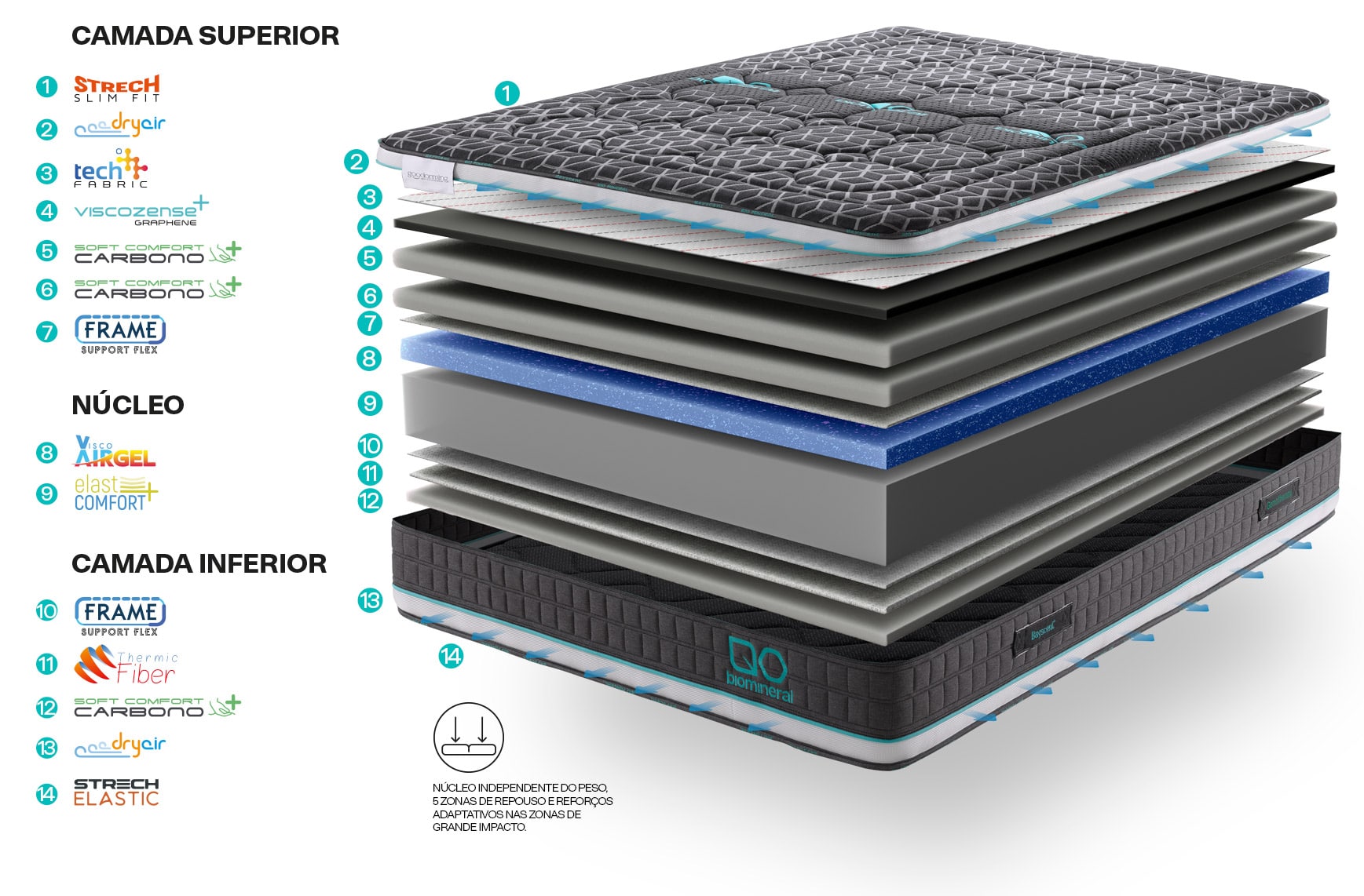 Núcleo independente do peso, 5 zonas de repouso que garantem uma postura correcta e um bom apoio da coluna vertebral.