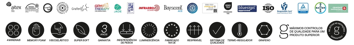 6 cm de Grafeno Viscoelástico e de Visco AirGel, Super Soft Memory Carbono, que se adapta ao seu corpo e lhe dá uma sensação de conforto, para além de reduzir a eletricidade estática.