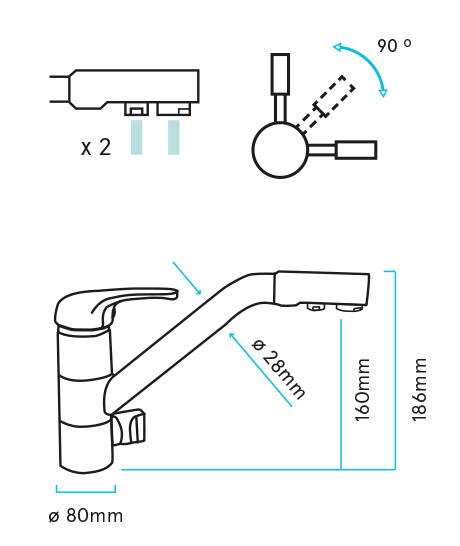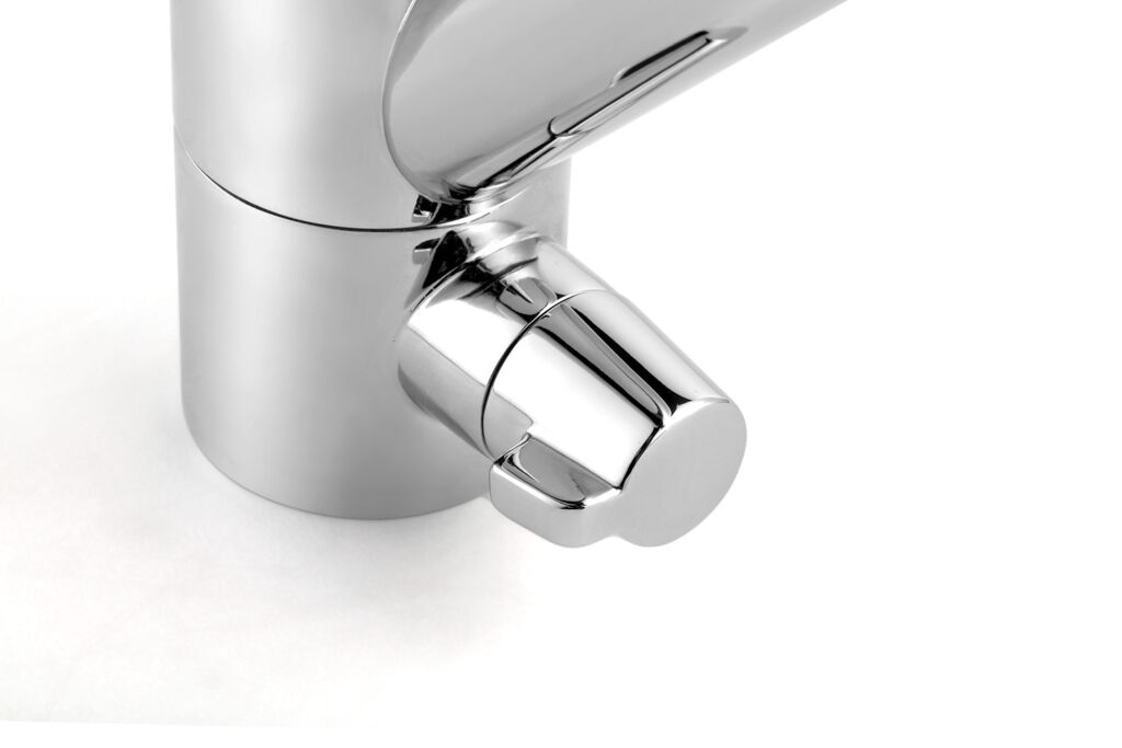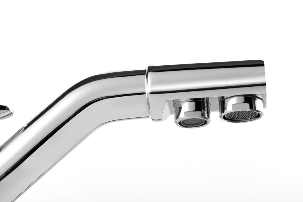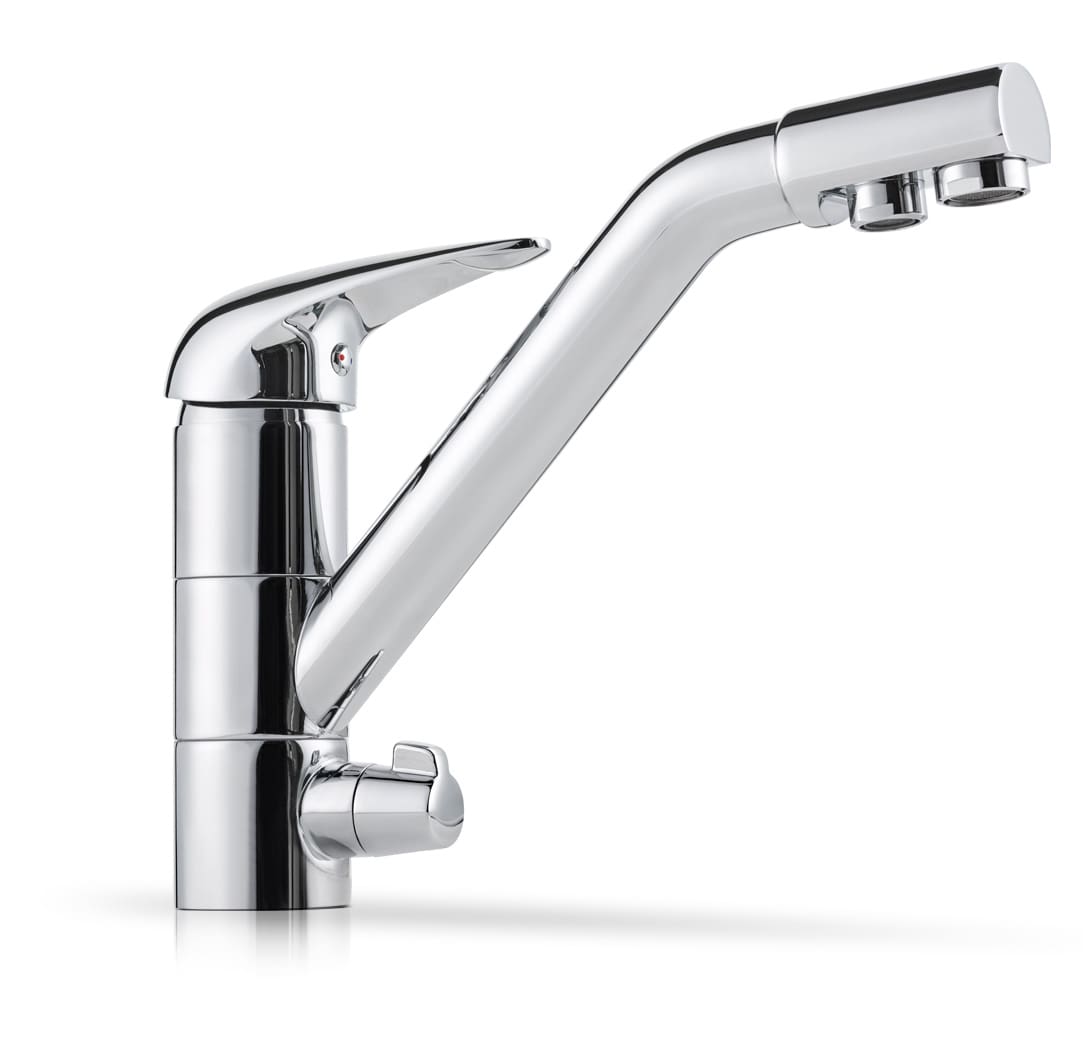 Função principal: Torneira de 3 vias para tratamento de água. Geralmente usado em sistemas de osmose reversa. Peso: 3,6 kg Tipos de água: Fria / quente / osmotizada Acabamento: Cromado brilhante Conexões: Água fria/quente: tubo de 3/8” Pressão máxima: 10 bar Temperatura (mín-máx): 0º C – 60º C Seletor de difusor: 2 posições: jato normal / jato de chuveiro